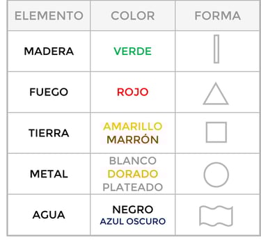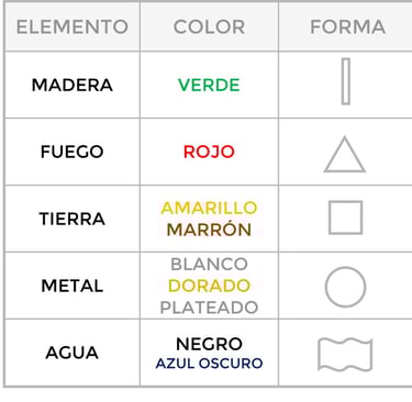 Por eso, cuando queramos utilizar uno de los 5 Elemento en nuestra casa, utilizaremos el color o la forma correspondientes a ese Elemento. En la siguiente tabla se puede ver la relación entre los Elementos y la forma y el color.